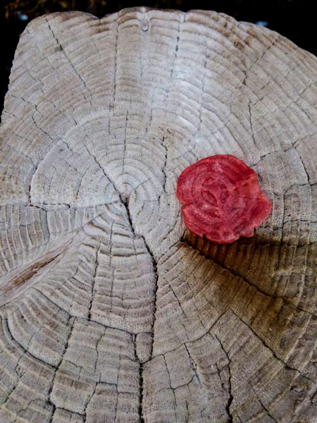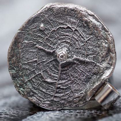 Ich wollte etwas Besonderes schaffen, etwas, das es so nur in Rheine gibt. Mit unserer Salinenanlage fühlt sich wohl jeder Rheinenser verbunden. Also richtete ich meinen Fokus auf das Gradierwerk. In dem alten, verwitterten und vom Salz ausgelaugten Holz wurde ich fündig. Diese Holzstrukturen faszinierten mich sofort. Mit Hilfe von Wachs habe ich Abdrücke angefertigt, die dann in Silber gegossen wurden. Da die Wachsform beim Gussvorgang verbrennt und sich das Holz, von dem der Abdruck stammt, durch Trockenheit oder Nässe, Hitze oder Kälte wieder verändert, ist ein Moment durch das Wachs festgehalten, der sich so nicht wiederholen lässt. Der graue Farbton des sanft schimmernden Silbers erinnert an die Farbe des ausgeblichenen Holzes.